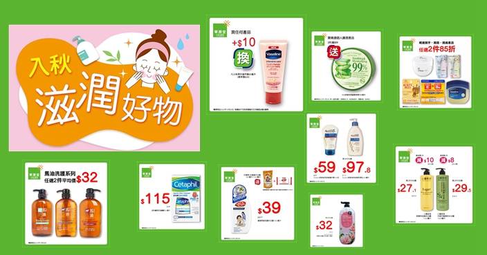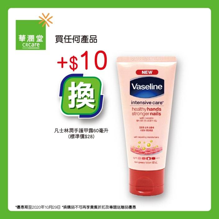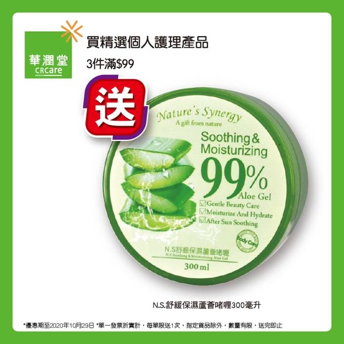 踏入秋季 ,天氣開始乾燥,水分流失,皮膚繃緊 ,係時候好好護理皮膚 。依家嚟華潤堂購買精選個人護理產品3件滿$99,送「N.S.舒緩保濕蘆薈啫喱300毫升」1件,買任何產品仲可以優惠價$10換購「凡士林潤手護甲露60毫升」(標準價$28)1件。